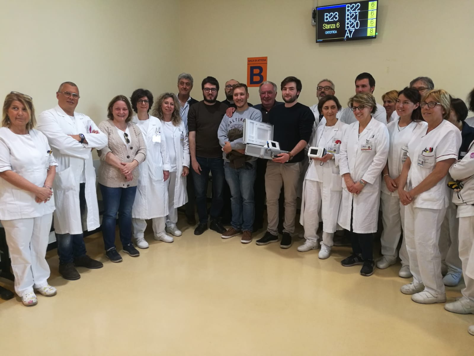 Lo staff del reparto di Oculistica di Asl3 insieme ai donatori (ARCI, ANPI - Crevari Invade). In primo piano gli apparecchi donati