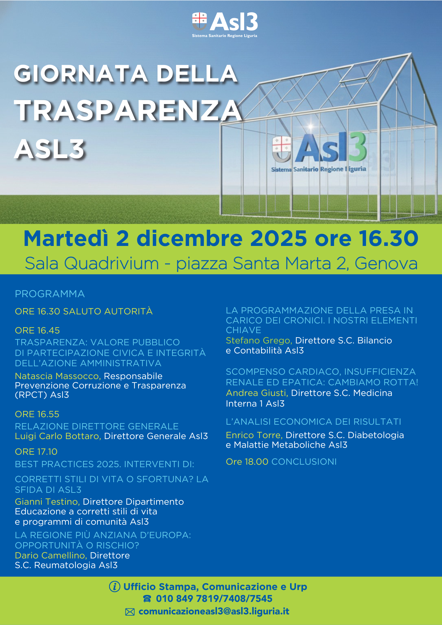 Martedì 4 dicembre alle ore 16.30, presso la Sala Quadrivium, Asl3 presenterà la Giornata della Trasparenza 2025. L'incontro è aperto alla cittadinanza