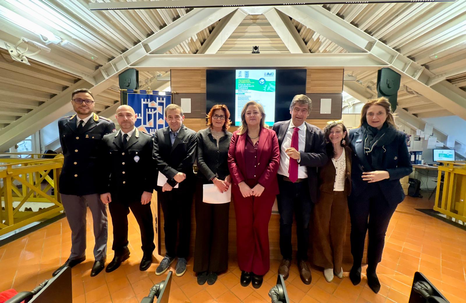 Hanno preso parte all’evento il Dott. Gianni Testino, Direttore Dipartimento Funzionale Educazione a Corretti Stili di Vita e Programmi di Comunità Asl3 insieme alle autorità intervenute e ad alcuni relatori: da sinistra Antonio Nervo, Commissario Polizia Stradale Genova; Fabio Manzo, Comandante ad interim del Corpo di Polizia Locale di Genova; Pierluigi Vinai, Direttore Generale ANCI Liguria; Isabella Cevasco, Direttore sociosanitario Asl3; Arianna Viscogliosi, Assessorato alla Sicurezza Urbana e Polizia Locale Comune di Genova; Patrizia Balbinot, Responsabile Benessere Organizzativo e lavoro d’Equipe dipartimento educazione; Irene Parapetti, Membro dell'Associazione Familiari e Vittime della Strada.